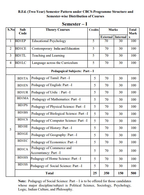 The B.Ed. programme shall be for duration of two academic years consisting of four semesters. Each semester is spread over for a period of 100 working days (36 hours in a week spreading over for 5 or 6 working days in a week, excluding the period of examination and admission.