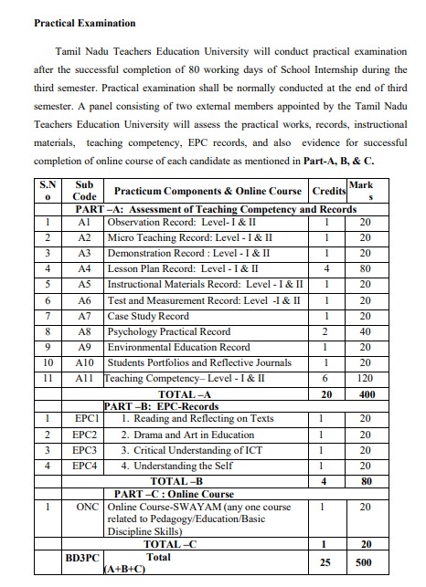 Each candidate, whose admission is approved by Tamil Nadu Teachers Education University only permitted for written and practical examinations. Candidates who have failed to satisfy the minimum attendance norms of Tamil Nadu Teachers Education University in each semester will not be permitted to appear for the written examination and or practical examinations. The term-end external examination for all semesters shall be conducted by the Tamil Nadu Teachers Education University at the end of each semester. The written examination for each theory course shall be conducted for 70 marks.